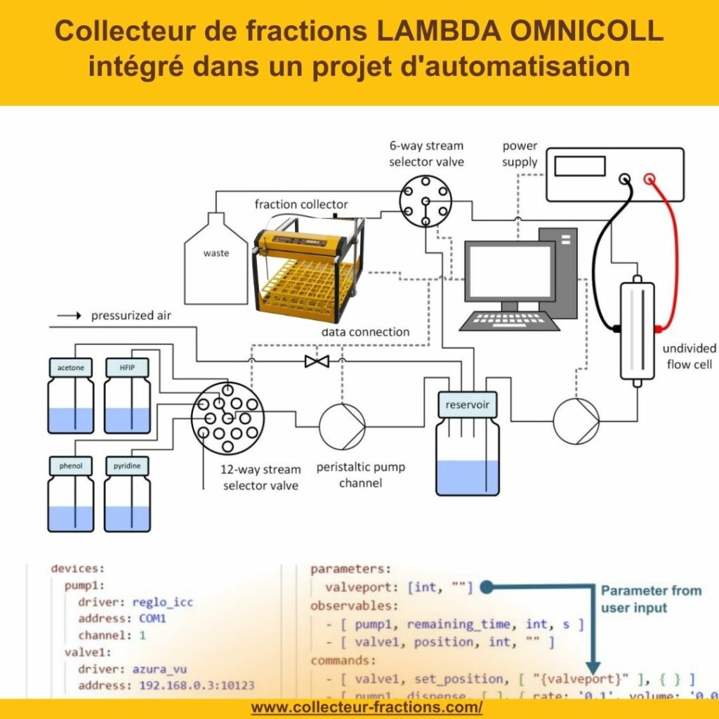 Réactions électrochimiques dans des configurations de flux avec vanne de commutation et collecteur de fractions LAMBDA OMNICOLL (pouvant être utilisé avec des récipients de collecte de différentes tailles) comme équipement périphérique pour collecter l’électrolyte.